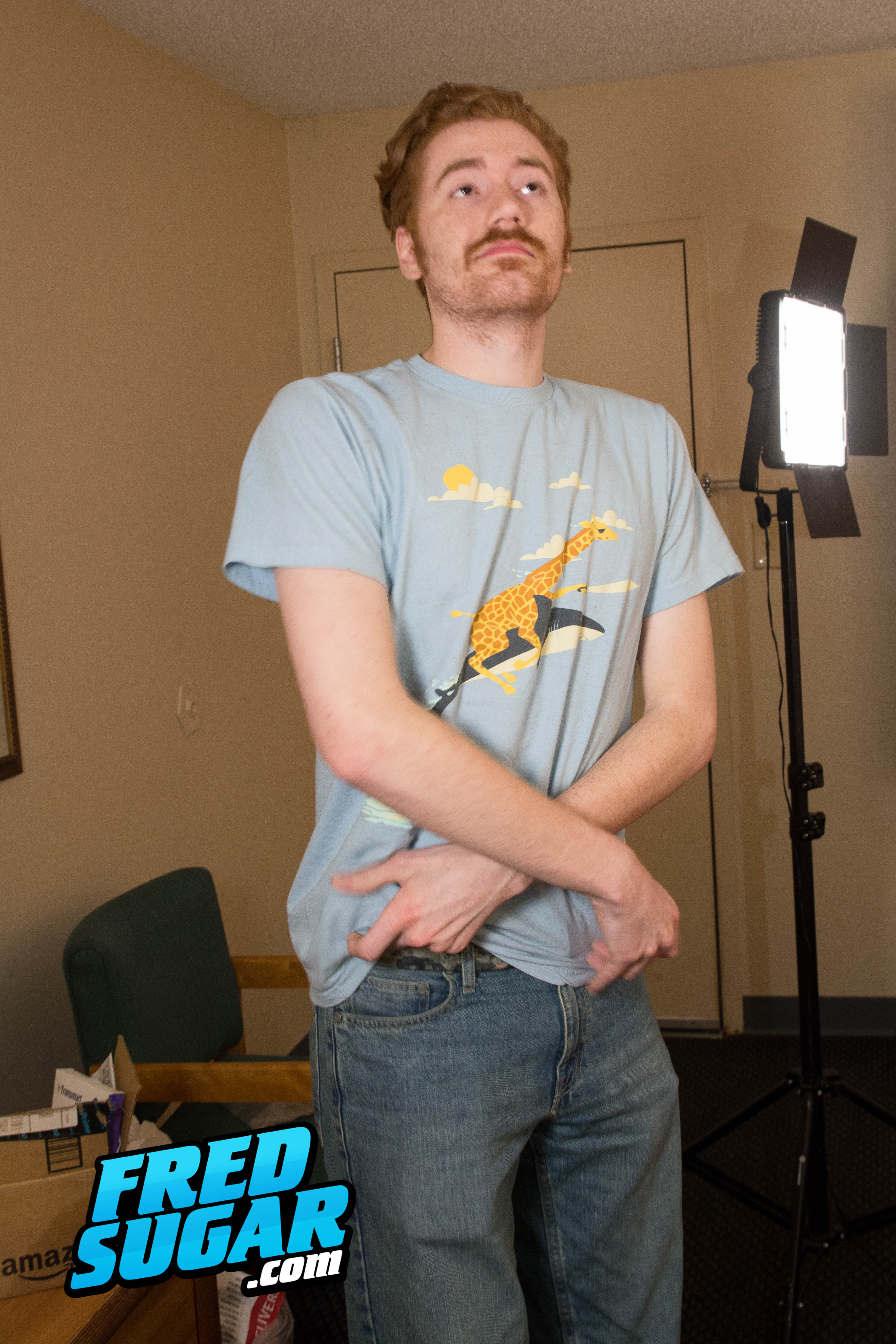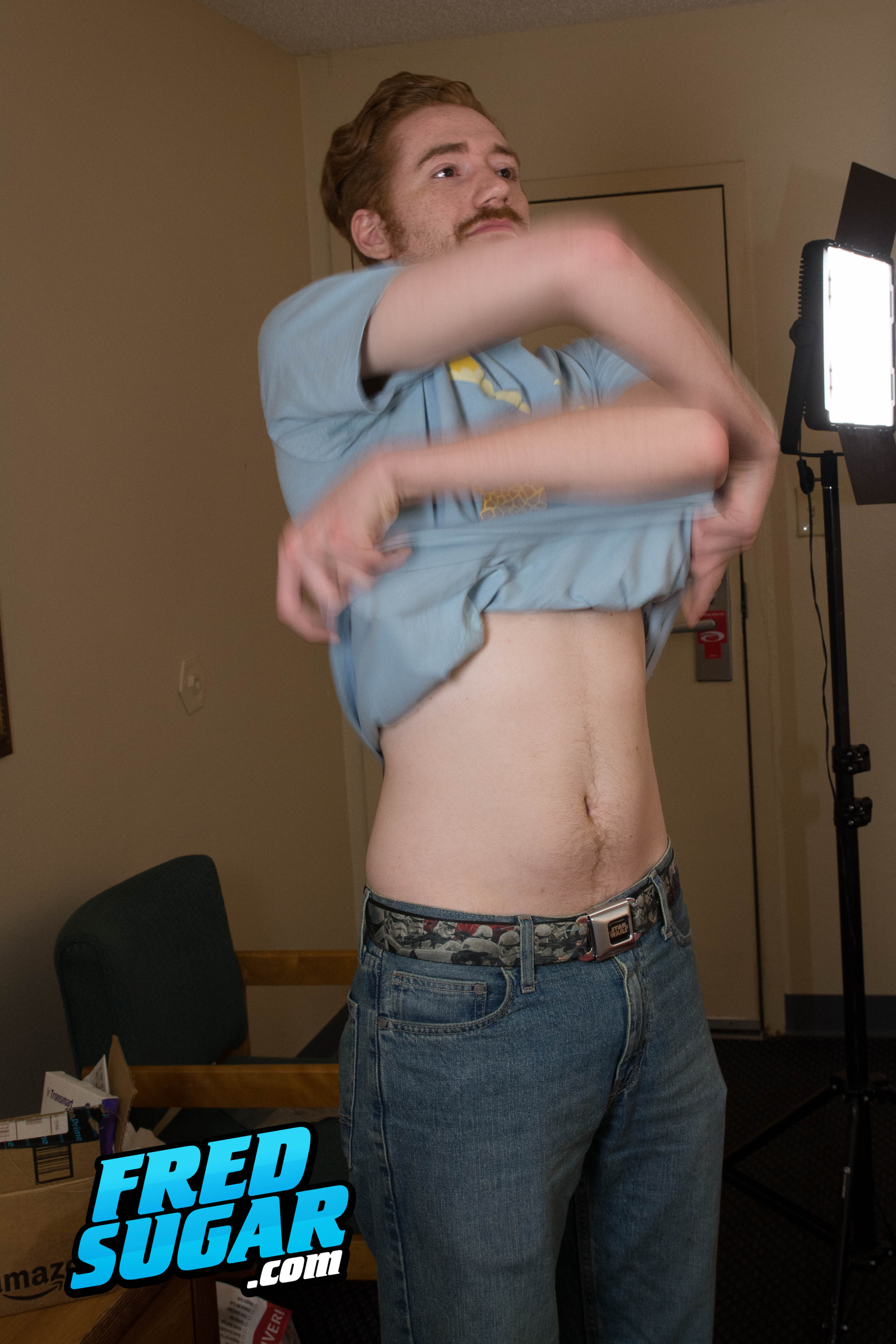 "Tall, lanky hung ginger, Sparky Cottonwood, initially expressed interest in doing a solo when he come in to shoot a straight scene. He wasn't nervous at all coming in solo. Posing for pics was going well. Then when he goes to jerk off, his dick starts to go limp. He tells us he almost never jerks off and when he does, it takes hours. ""Now he tells me!"", runs through my mind! But then I take the opportunity to offer him my manhandling services. He's horny and wants to get off, and of course he wants to get paid, so he goes for it, he doesn't think it will work, but if he gets manhandled he gets paid anyway, so he goes for it without hesitation.