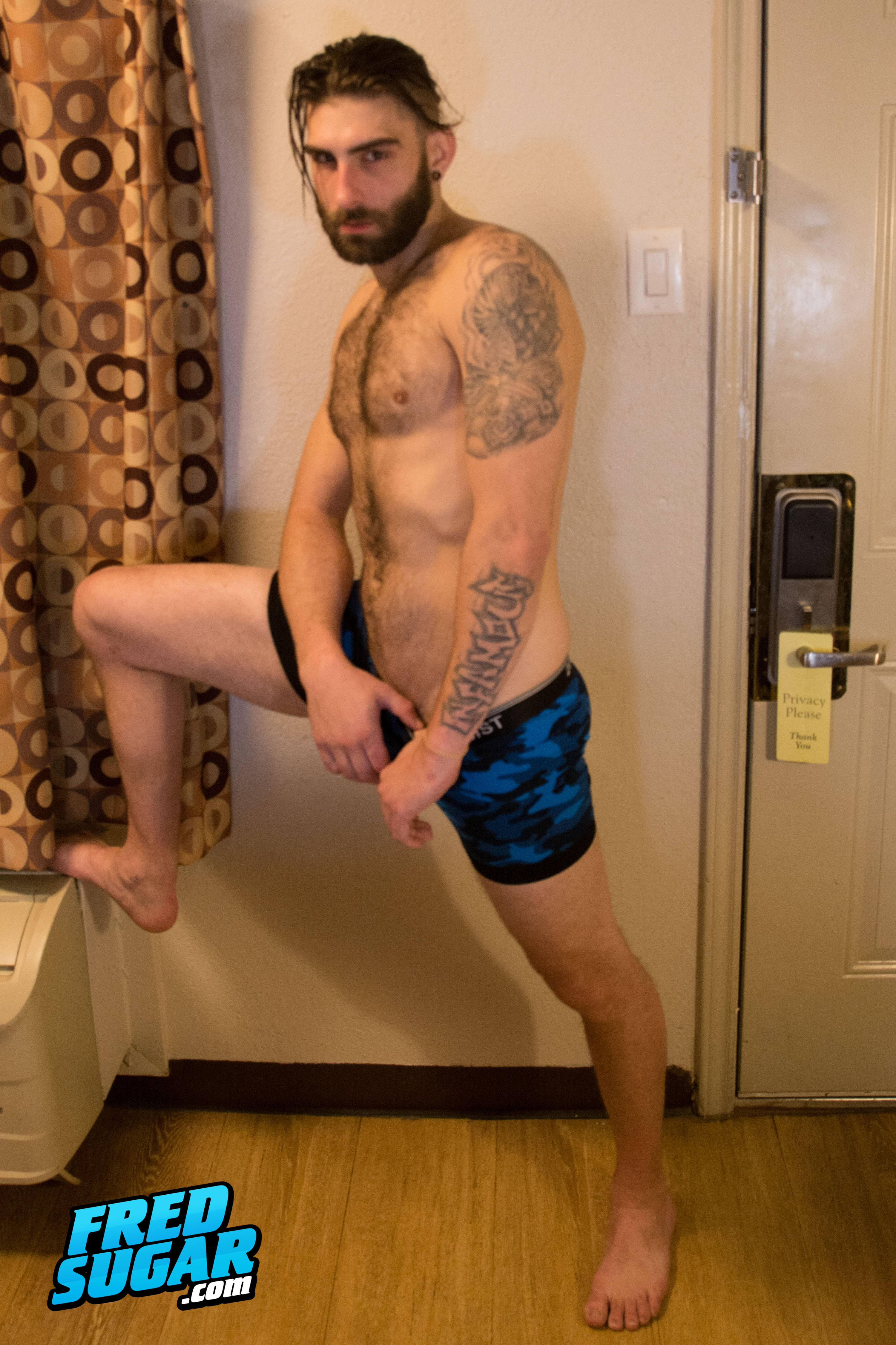 Hairy, otter build. Very friendly,bartender, he mentioned that he had done some amateur video with his girlfriend and we even talked about possibly shooting some couple's content. Very horny but a bit camera shy, with lots of stroking and rubbing, even a bit of a helping hand, we finally got a cumshot out of him. Hopefully will get a chance to bring him back for more.