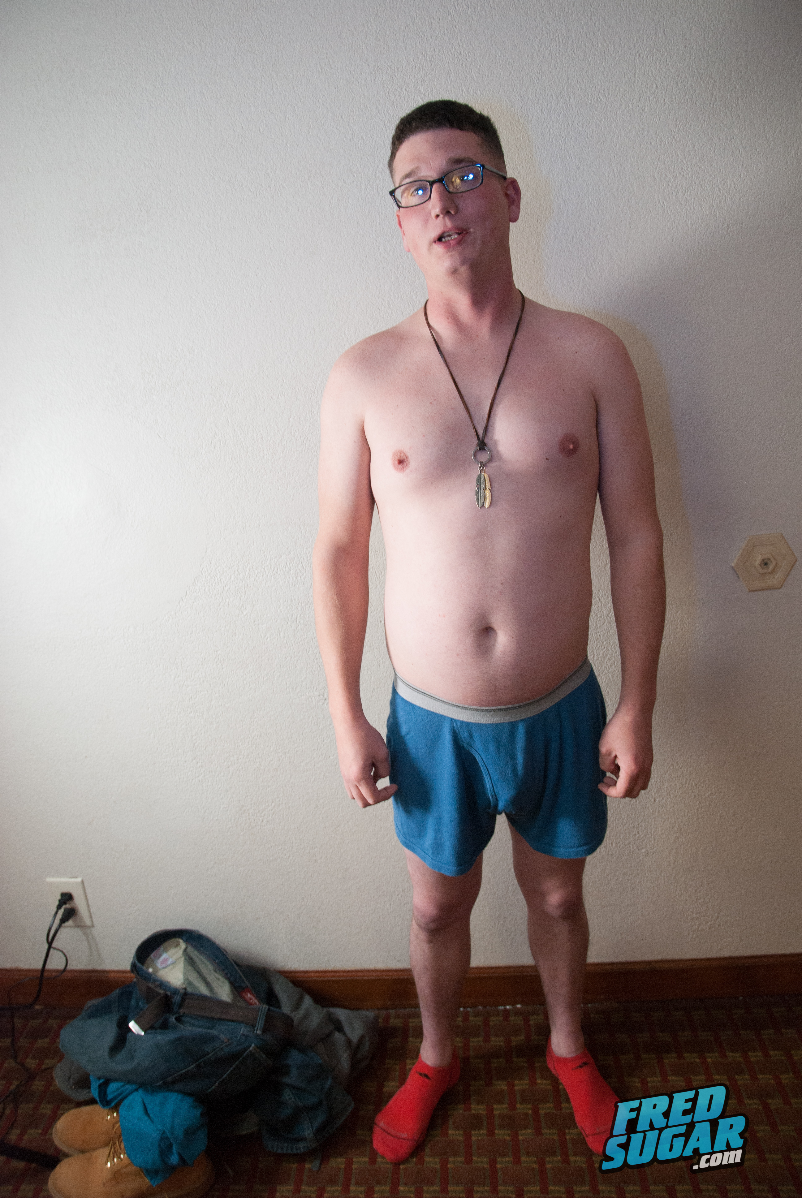 Cocky, confident young guy. Named himself, Baby Blue, after his eye color. While it was nice to see this innocent faced, 25 year old with his baby fat nude. He had problems getting a fully solid hard on to measure, and interestingly enough when he did get hard, the measurement came up shorter! He does get that cumshot out in the end. He doesn't act quite so confidently now though. For those of you who love those REAL nervous straight guys. Definitely no acting here on Fredsugar.com